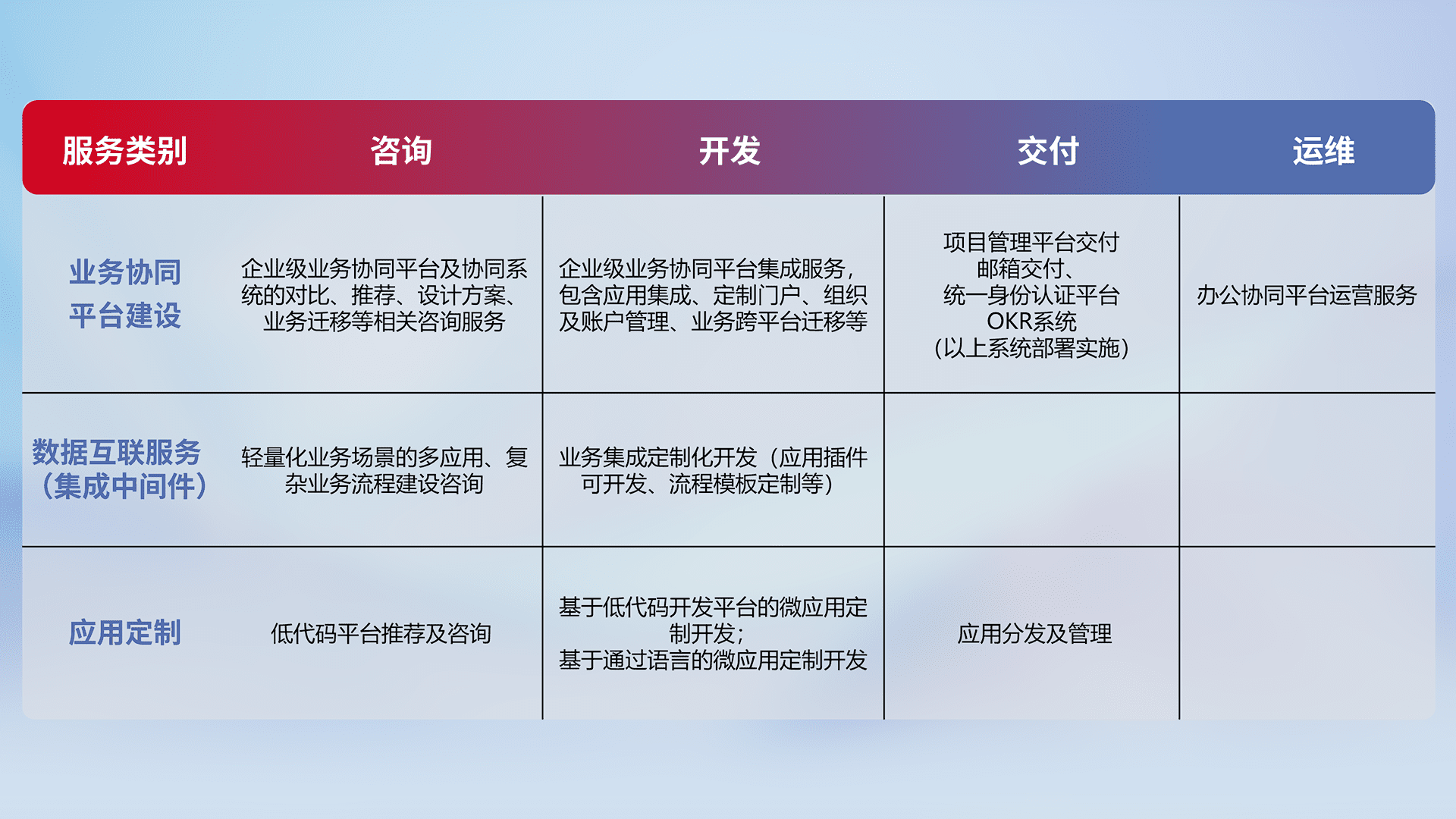 针对钉钉、、、、企微、、、IDaas等平台级产品提供产品的规划、、、、方案、、、、交付、、、定制化开发等服务,,实现如统一协同办公、、智能客户服务、、、混合会议管理、、、、智能数据查询、、、等业务场景,,实现数字化转型。。