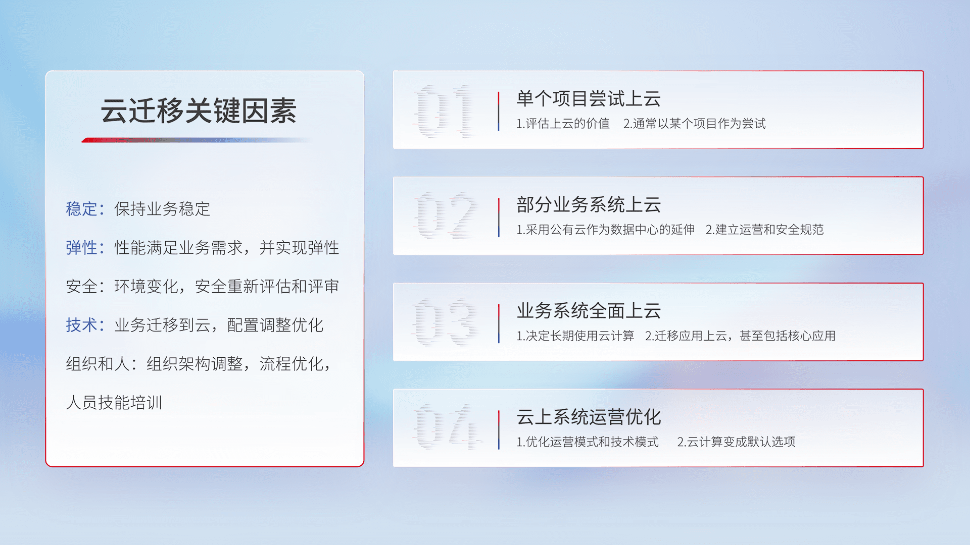 结合实际业务,,,,从规划设计、、、云平台选型、、、云原生改造、、、数据迁移、、集成交付,,,迁移全过程为客户识别最佳上云路径,,做好风险识别管理,,,,设计网络架构、、、、身份权限、、、、安全审计合规、、操作审计、、、、日志审计、、、监控告警策略、、、、多站点容灾设计等,,,,对云上基础设施进行整体规划,,,,提升IT治理水平,,,以满足弹性、、、高可用、、、高性能的需求。。。