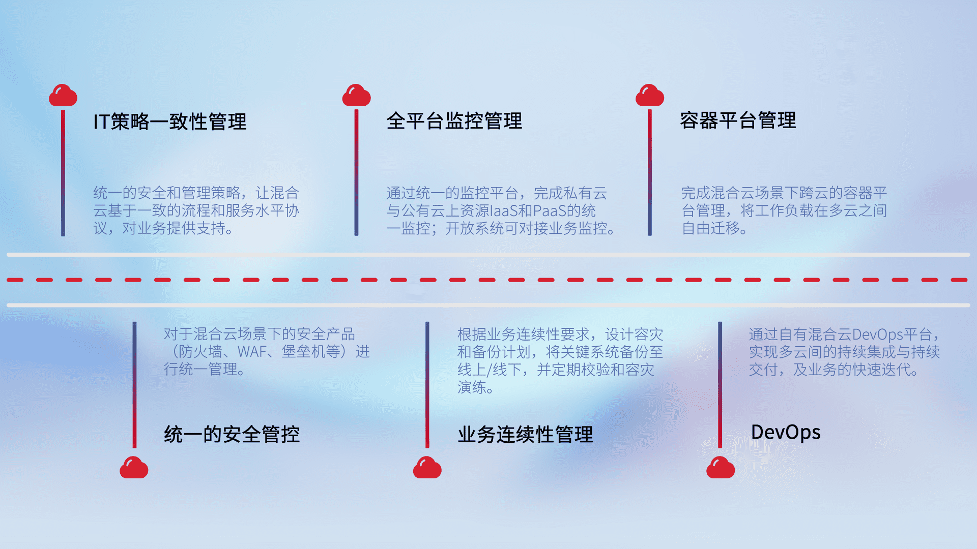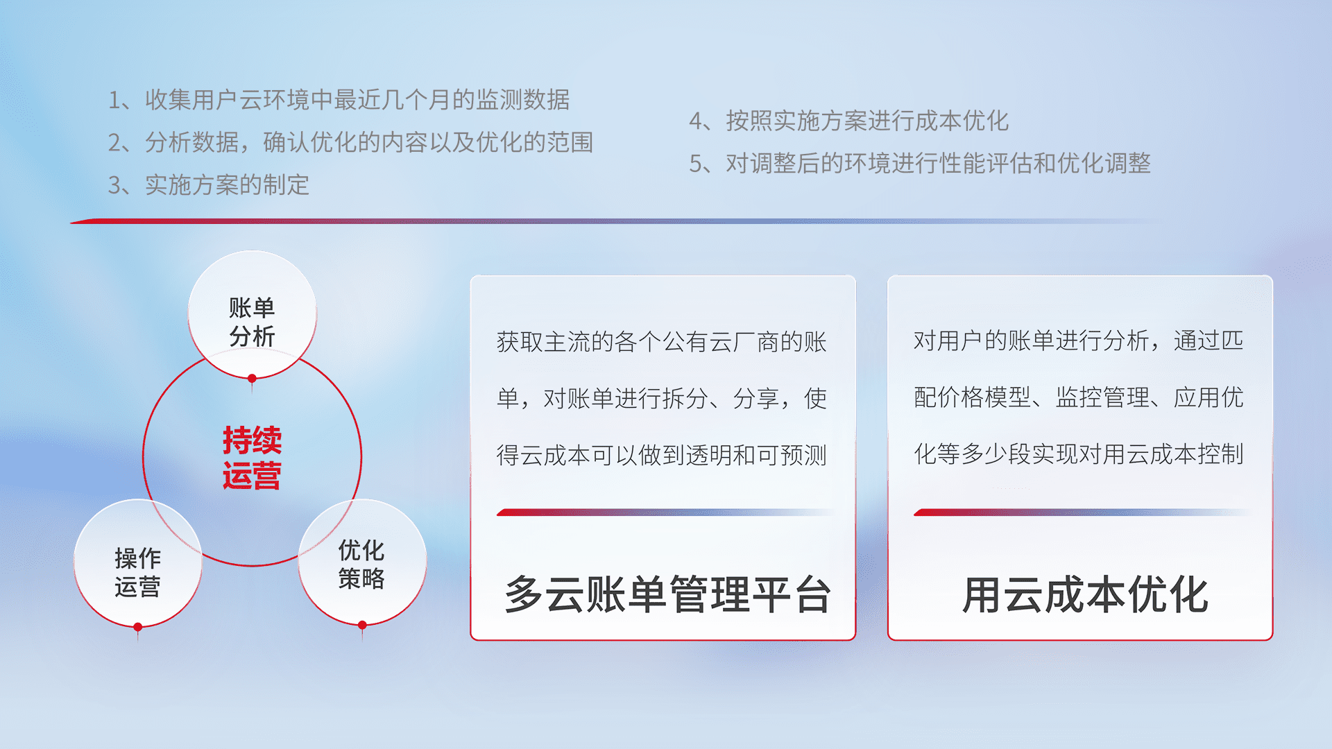 通过多云纳管,,,,以统一的资源数据模型把客户的云资源进行抽象和封装,,,进而实现对多云资源的统一操作,,,,保障云资源管理的可靠性、、、、稳定性与可用性。。。。量身定制化运维内容,,配置、、、开发运维、、、补丁管理、、备份、、监控、、认证和访问管理、、、审计和日常巡检等,,,保障在用云过程中的可靠度,,,,稳定度以及高可用率。。