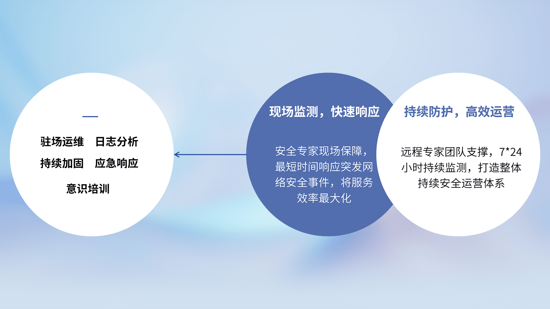 7X24小时持续监测安全事件,保持安全策略有效性,降低资产脆弱性风险,,精准拦截黑客攻击,,,减少被黑客利用的机会,,,,第一时间遏制,,,降低损失。。